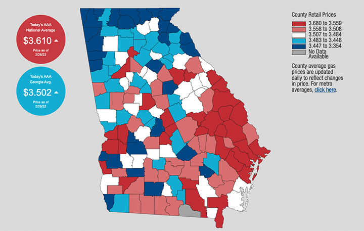 “Georgians continue to feel pain at the pumps,” said Montrae Waiters, AAA-The Auto Club Group spokeswoman. “Industry professionals warn gas prices are likely to climb even higher if the conflict between Russia and Ukraine continues.”