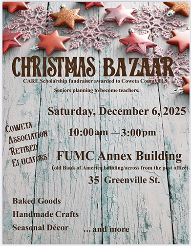 The Coweta Association of Retired Educators (CARE) will host their annual Christmas Bazaar on Saturday, December 6, from 10 a.m. to 3 p.m., in the First United Methodist Church Annex, located at 35 Greenville Street in downtown Newnan.