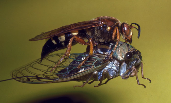 Cicada killers can be intimidating because they are the largest wasp in Georgia, but they are not something that we have to worry about. Cicadas, on the other hand, should be very afraid. Cicada killer wasp adults feed on nectar but use paralyzed cicadas to feed their young.