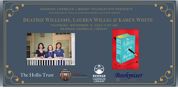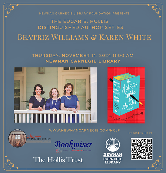 “We are so excited Beatriz Williams will be visiting Newnan for the first time and that Karen White is returning,” says Carnegie Director, Susan Crutchfield. “Their new book is delightful and very funny, and I am looking forward to our patrons hearing all about it. We love having the opportunity to host such amazing authors in our community!”