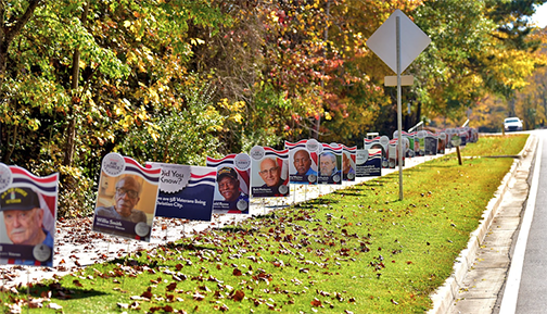 The celebration began on Monday, November 7 with the presentation of the Walk of Honor. Signs with photos of veterans who live or work at Christian City line Red Oak Road and Lester Road.