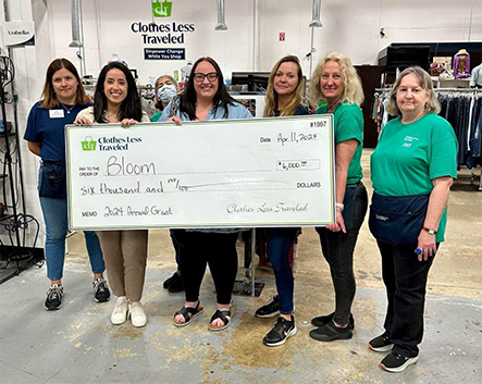 Nonprofit Thrift Shop staff members present $6,000 grant to Bloom Our Youth, a foster care nonprofit, representatives.