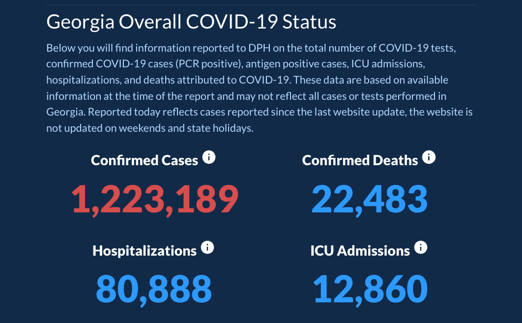 The Daily Status Report generated by the Georgia Department of Public Health publishes Monday thru Friday at 3 p.m.