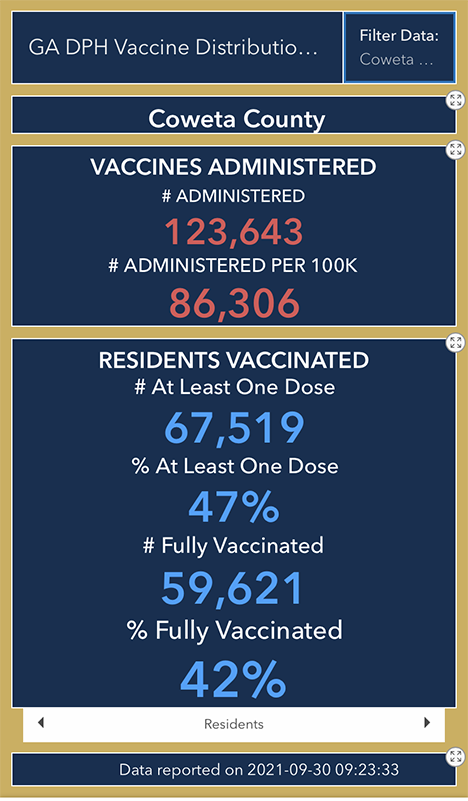 Regarding vaccinations, the Georgia Department of Public Health reports that 123,643 vaccinations have been applied here in Coweta County through Sept. 30. Of those, 67,519 people or 47 percent have 1 dose of the vaccine while 59,621 or 42 percent of Coweta residents have been fully vaccinated.