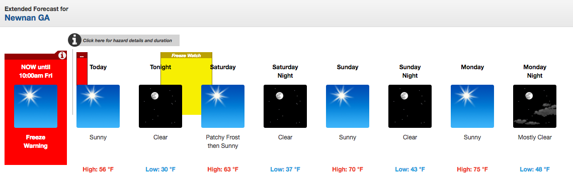 A Freeze Warning is in effect until 10 a.m. today, then a Freeze Watch goes into effect tonight at midnight through 10 a.m. on Saturday. Lows tonight are expected to be near 30 with lows  on Saturday night to drop to near 37.