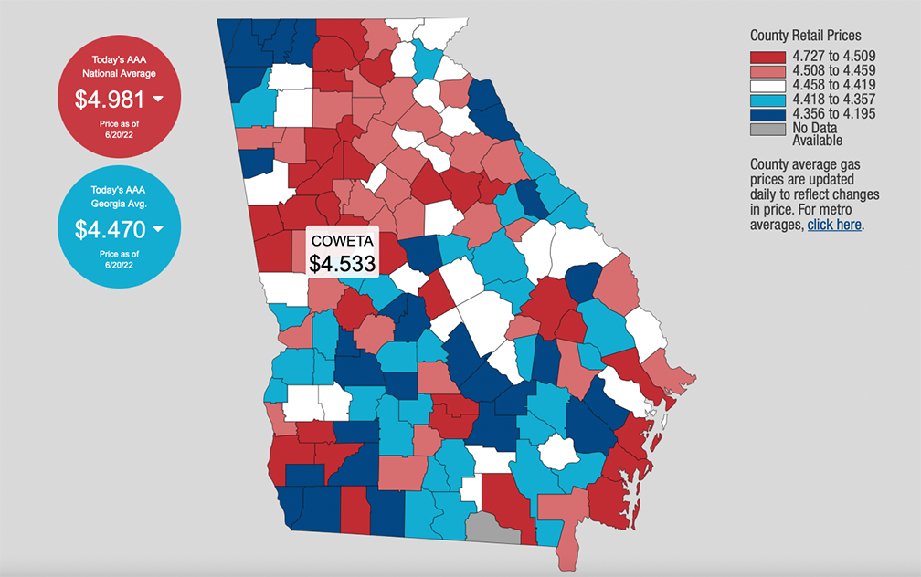 Locally, the average cost for a gallon of regular unleaded in Coweta County is $4.533, about six cents higher than the state’s average. Lowest gas prices on Monday, according to GasBuddy, is $4.25 at Costco, followed by $4.28 at Sam’s Club, $4.29 at BJ’s Club, $4.39 at Pilot and $4.49 at Kroger, RaceTrac and QuikTrip.