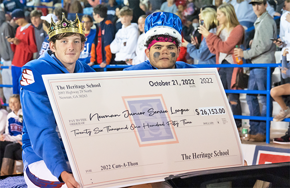 Senior boys were nominated for Homecoming King through an initial donation. After securing their nomination, students, friends, and family “voted” for their favorite senior to win the crown. Every dollar donated to the campaign equaled one vote. During the one week campaign, the Heritage School had 148 unique donors give $26,153. LJ Estrada raised the most amount of funds for the campaign and was crowned Homecoming King during the school’s 2022 Powderpuff Game. Jack Butler, as the senior who had the most unique donors, was crowned the Homecoming Prince. Estrada and Butler presented the check to The Heritage School Key Club President Henry Wilgus and Vice President Mack Mikko during the Homecoming Half-Time Ceremony.