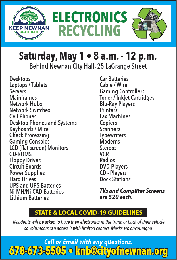 An Electronics Recycling Event will take place on Saturday, May 1 behind City Hall in downtown Newnan.
