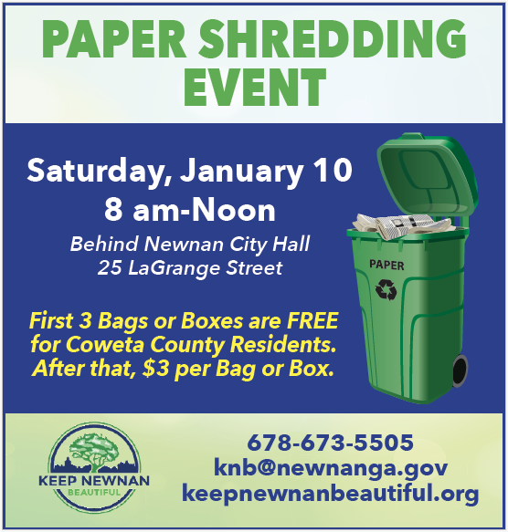 The first of four Paper Shredding Events in 2026 will take place on Saturday, January 10 behind City Hall in downtown Newnan.