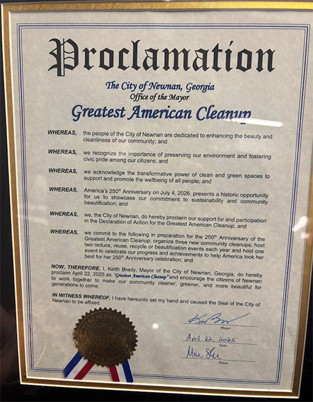 Mayor Keith Brady this week signed a proclamation regarding Keep Newnan Beautiful’s participation in the Greatest American Cleanup, a nationwide effort to cleanup and beautify America’s parks, public spaces, and waterways in time for America’s 250th Birthday Celebration in 2026.