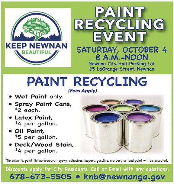 Next on the calendar will be the second Paint Recyling outing of 2025. It is scheduled for Saturday, October 4 from 8 a.m. to noon. It will also be held in the parking lot behind Newnan City Hall. Fees will apply for this event. Spray Paint Cans will be $2 each, Latex Paint is $4 per gallon, Oil Paint is $5 per gallon and Deck/Wood Stain is $4 per gallon. No solvents, paint thinner/remover, epoxy, adhesives, laquers, gasoline, mercury or lead paint will be accepted.