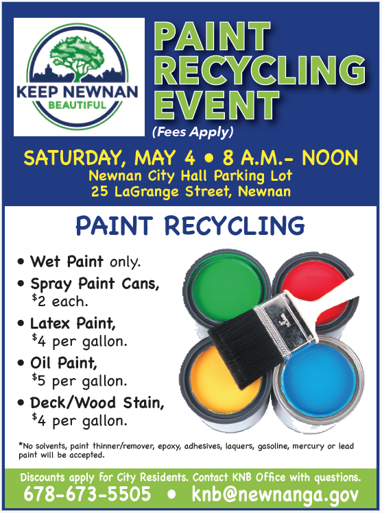 Keep Newnan Beautiful will host a Paint Recycling event on Saturday, May 4, the first of two paint recycling events scheduled in 2024.