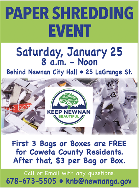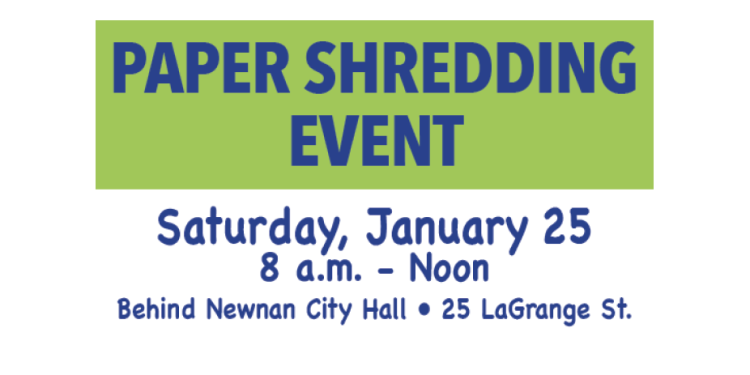 The first of four Paper Shredding Events in 2025 will take place on Saturday, January 25 behind City Hall in downtown Newnan.