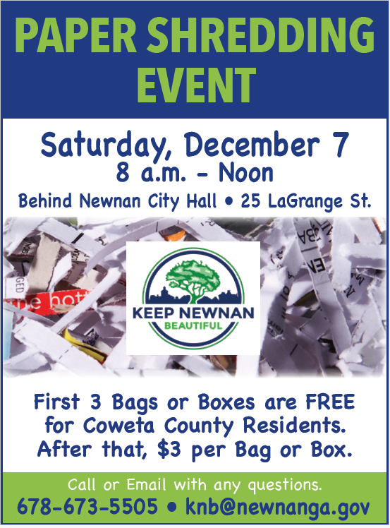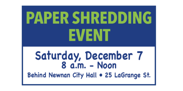 The fourth and final Paper Shredding Event in 2024 will take place on Saturday, December 7 behind City Hall in downtown Newnan.