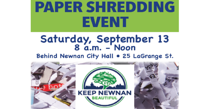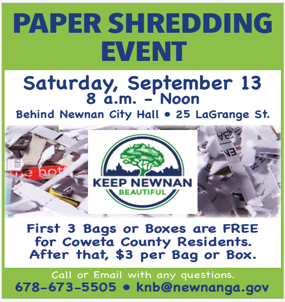 The third of four Paper Shredding Events in 2025 will take place on Saturday, September 13 behind City Hall in downtown Newnan.
