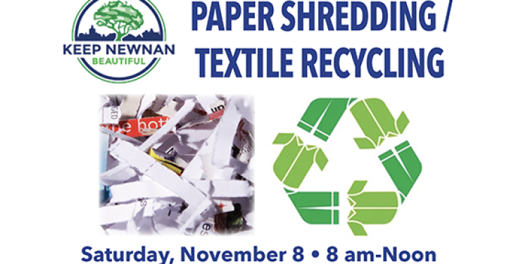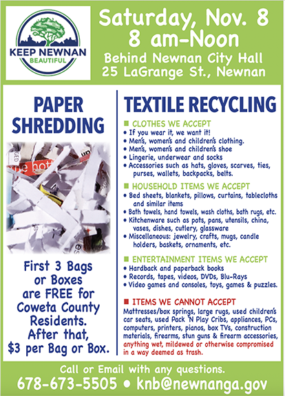 The event will feature Paper Shredding and KNB’s second-ever Textile Recycling. Both will take place from 8 a.m. to Noon in the parking lot behind Newnan’s City Hall at 25 LaGrange Street.