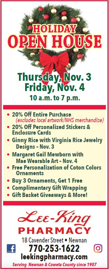 And why not start those wonderful times with two days of a Holiday Open House at Lee-King Pharmacy in Newnan on Thursday, November 3 and Friday, November 4. The two-day shopping extravaganza will be from 10 a.m. to 7 p.m. each day (an hour longer this year) and feature discounts, giveaways and much, much more.