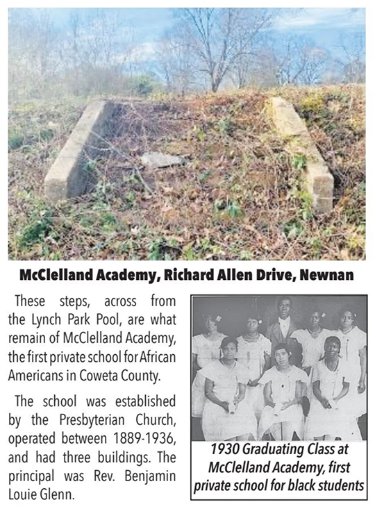 These steps, across from the Lynch Park Pool, are what remain of McClelland Academy, the first private school for African Americans in Coweta County. The school was established by the Presbyterian Church, operated between 1889 – 1936, and had three buildings. The principal was Rev. Benjamin Louie Glenn.