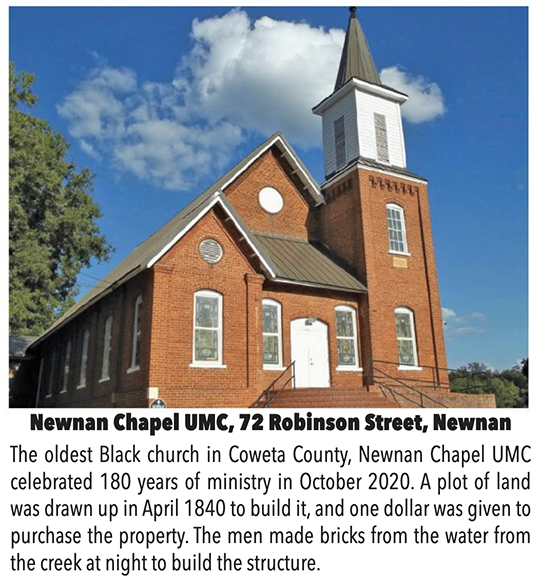 The oldest Black church in Coweta County, Newnan Chapel UMC celebrated 180 years of ministry in October 2020. A plot of land was drawn up in April 1840 to build it, and one dollar was given to purchase the property. The men made bricks from the water from the creek at night to build the structure.