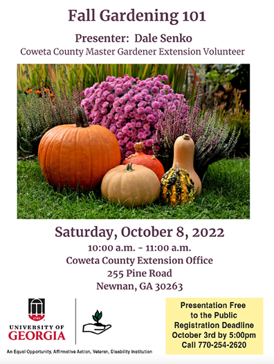 The Coweta County Master Gardener Extension Volunteers (MGEVs) will host a free presentation entitled “Fall Gardening 101” on Saturday, October 8.