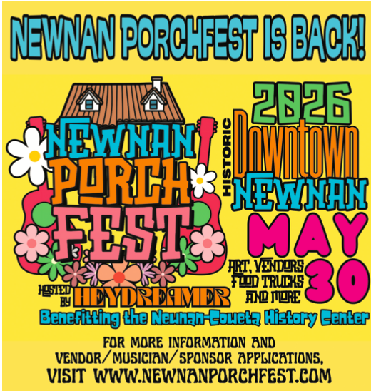 Newnan Porchfest is grateful to the City of Newnan for approving beer and wine sales for this year’s festival on May 30, 2026! That means even more ways to kick back, stay hydrated, and enjoy some of the best live music around as you stroll through one of Newnan’s most beautiful neighborhoods.