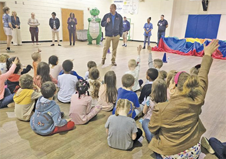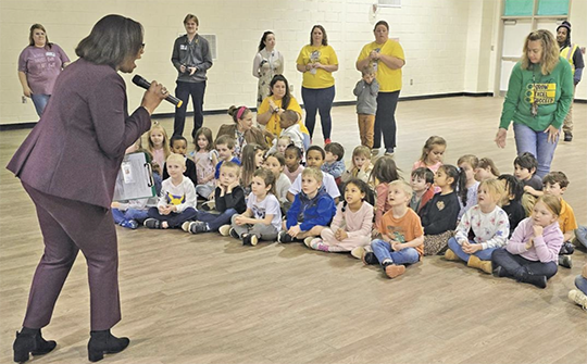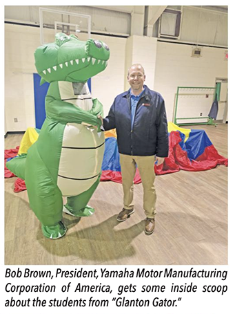 Pictured above: Employees at Yamaha Motor Manufacturing Corporation, here in Newnan, lift the parachute to unveil a wonderful surprise to students at Glanton Elementary in Grantville.