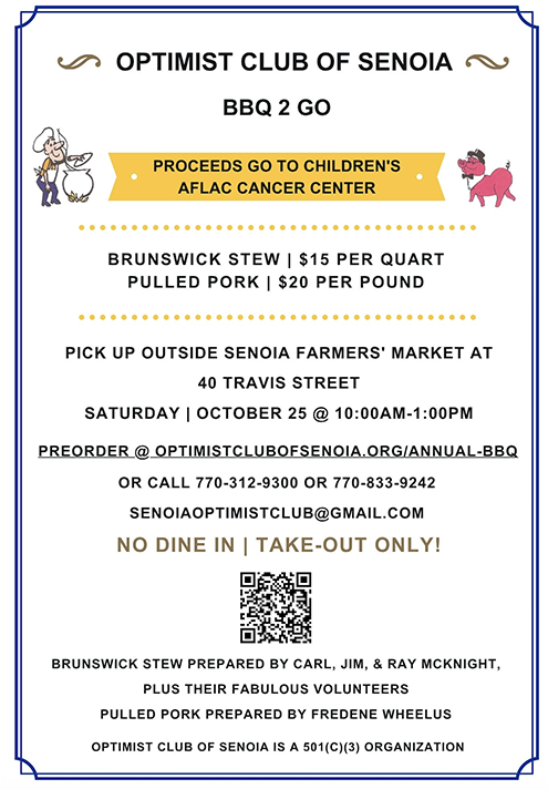 All items are “to go”. Quarts of stew are $15, and pounds of pulled pork are $20. This year you can preorder these items online by going to https://optimistclubofsenoia.org/annual-bbq/ or by scanning the QR code on the flyer below. You can also contact an active member of the local Optimist Club or call 770-312-9300 or 770-833-9242 to place your order, especially if you won’t be able to make it on October 25th and need to have your purchase held for you. You can also email the club at [email protected] with your order or a question.