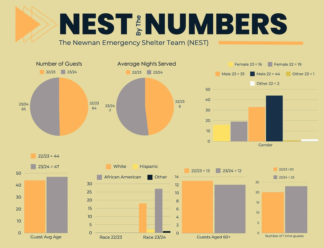 In the fall of 2018, Ellison started having conversations with other community leaders, which led to the formation of a warming shelter called NEST (Newnan Emergency Shelter Team) in January 2019. Other churches became involved, each sponsoring a night to house those in need.