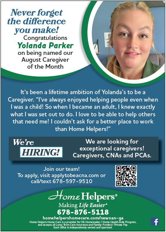 Are you an Exceptional Caregiver? – Join the Home Helpers team today! Now hiring Caregivers, CNAs and PCAs. Competitive wages. To apply, visit: applytobeaCNA.com or call or text: 678-597-9510.