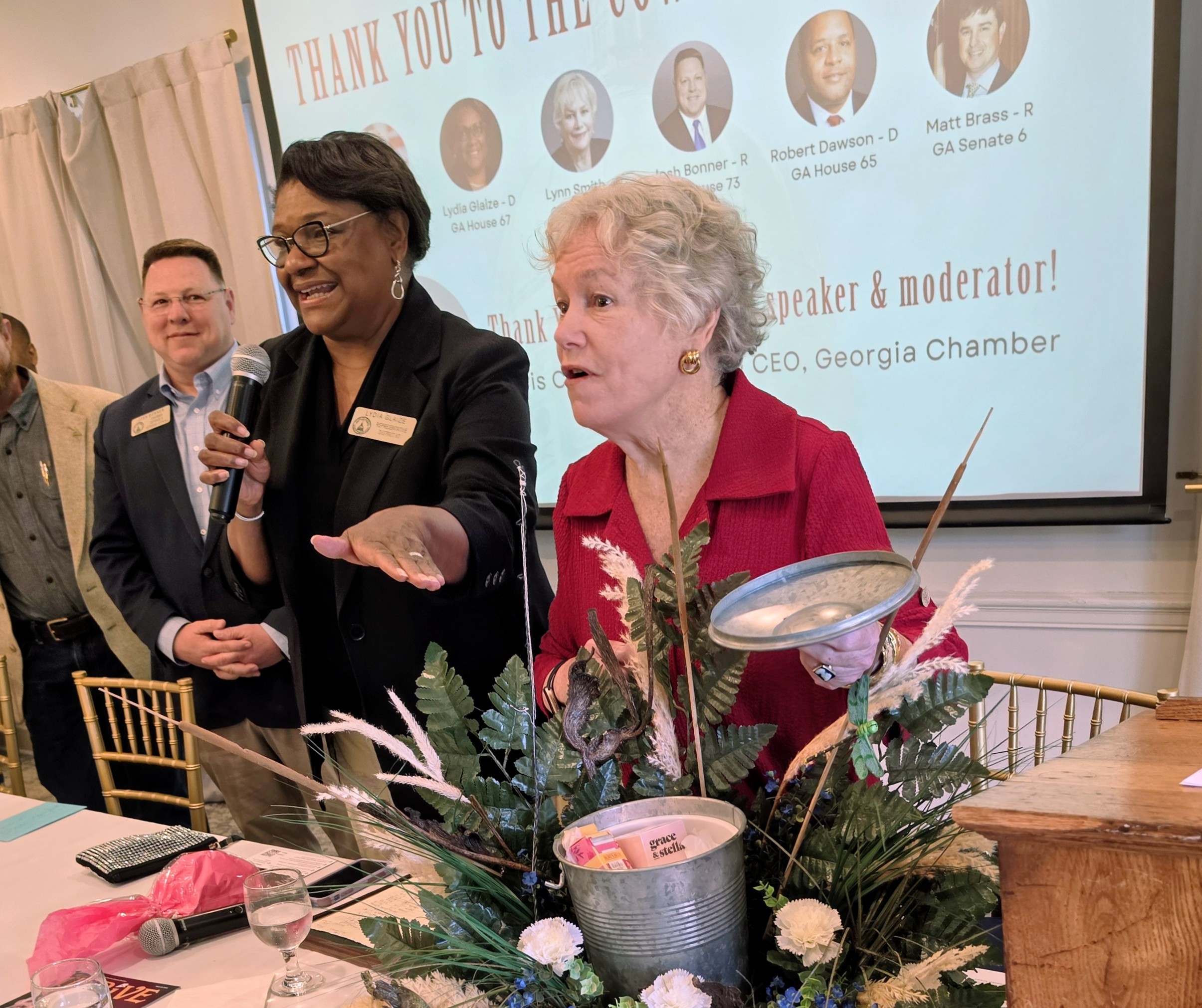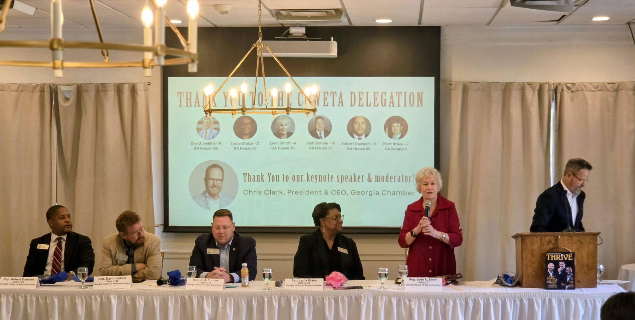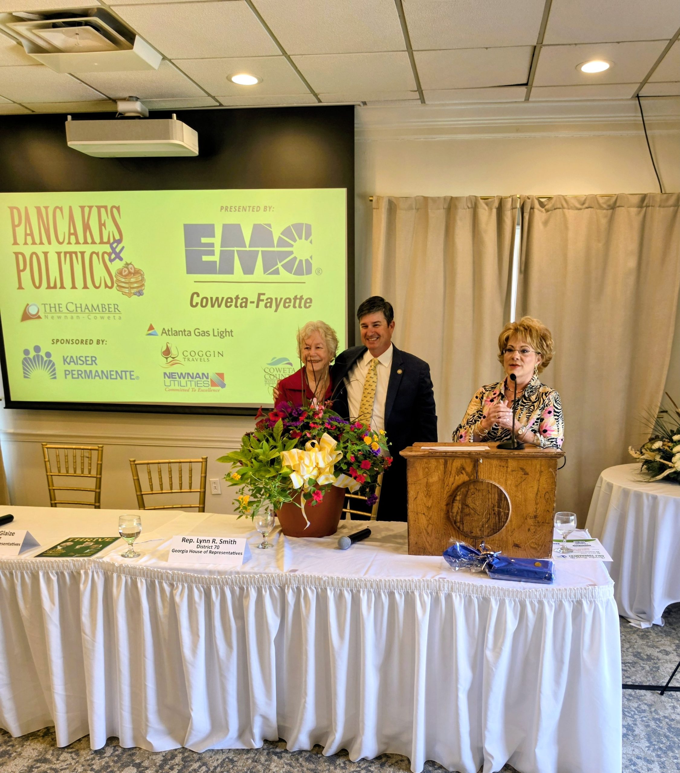 Standing ovations greeted Smith at the annual Newnan-Coweta Chamber of Commerce Pancakes and Politics breakfast.