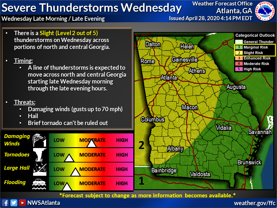The National Weather Service in Peachtree City says there is a slight chance of severe weather later today here in Coweta County.