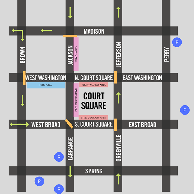 This event will require closing of several downtown Newnan streets – Jackson Street (between Madison Street and West Broad Street), West Washington Street/North Court Square (between Brown Street and Greenville Street), and South Court Square (between Jackson Street and Greenville Street). The streets will close early around 11 a.m. and should reopen at approximately 8 p.m.