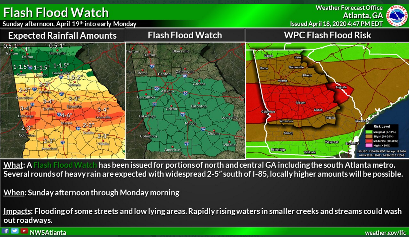 Locally, a 100 percent rain chance is in the forecast for today and tonight with rain amounts of 2-5 inches possible. As a result, a Flash Flood Watch will be in effect beginning at 11 a.m. until Monday morning for Coweta and surrounding counties. Rain will move out of the area by noon on Monday as sunny skies return.