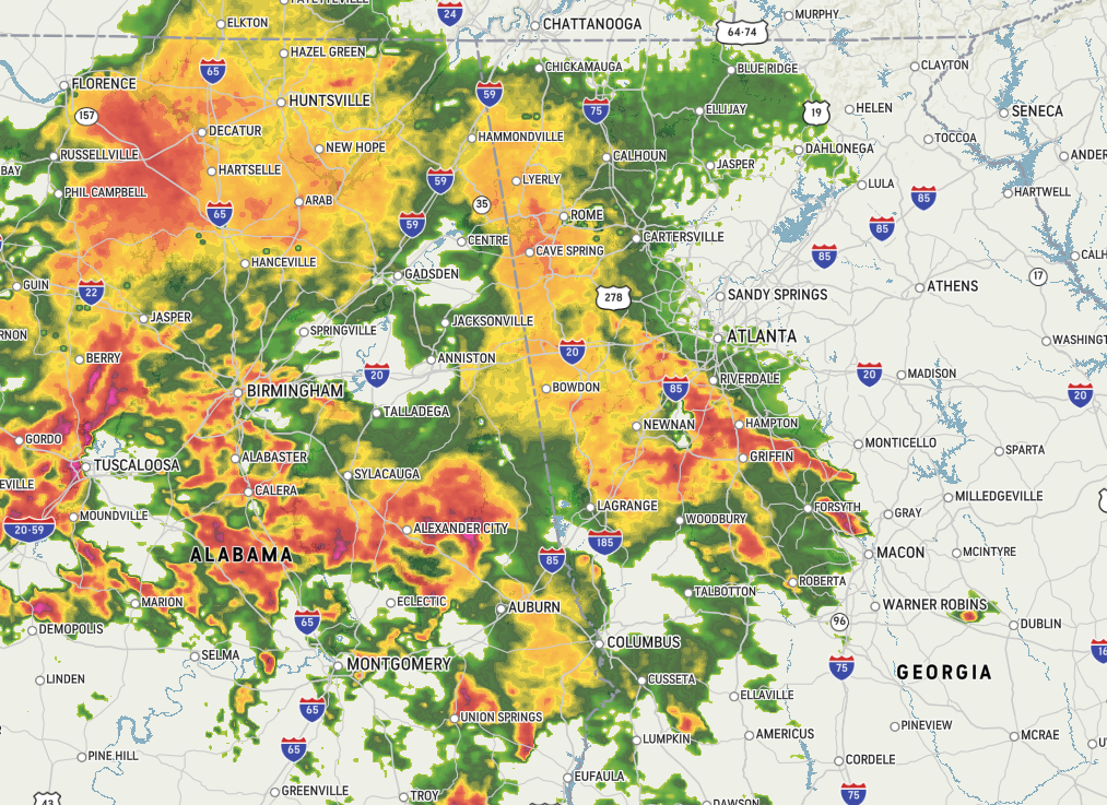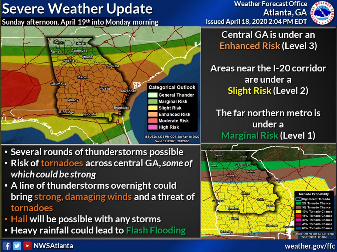 Scattered to numerous severe thunderstorms are expected across central and portions of north Georgia this afternoon and later tonight, including Coweta County. The National Weather Service says the greatest threat is expected along and south of I-20 with central Georgia most favored for tornadoes and hail.