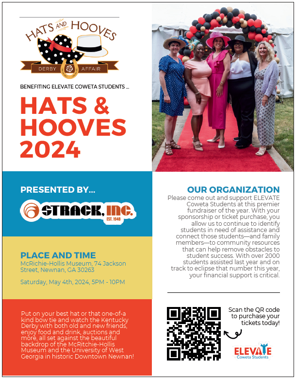The Kentucky Derby is just around the corner and once again ELEVATE Coweta Students will host their annual Hats and Hooves Kentucky Derby Fundraiser. ELEVATE Coweta Students mission is to elevate our students to success in school, in our community, and in life. We surround students with a community of support, empowering them to stay in school and achieve in life.