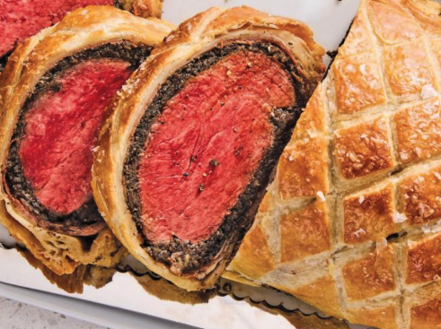 Preheat oven to 400f. Remove Wellington from plastic wrap and evenly brush egg wash over the whole Wellington. Place this on a foil-lined pan and cook for 35 minutes. Remove and let rest for 10 minutes. Slice into 1 inch slices.
