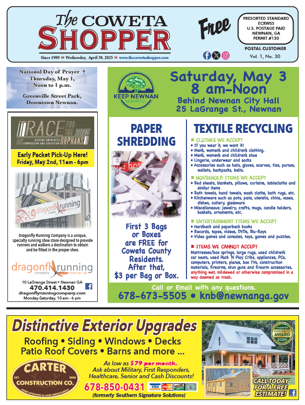 The April 30 issue of The Coweta Shopper is now available for our readers online in a digital replica format.