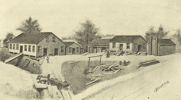 Pictured is a rendering of the early R.D. Cole Manufacturing plant including the 24 x 36-foot wooden framed shop R.D. Cole originally used to conduct his business.