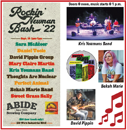 9/10 … Rockin’ Newnan Bash 2022, 1 pm … Sara McAteer, Daniel Toole, David Pippin Group, Mary Claire Martin, Kris Yuma’s Band, Thoughts Are Nuclear, Perfect Animal, Bekah Marie Band, Sweet Grass Sally