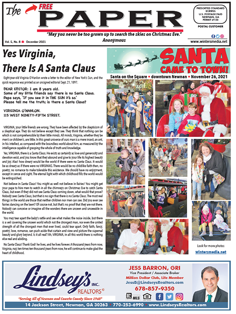 This month’s front page is all about Santa Claus. The popular New York Sun editorial entitled ‘Yes Virginia, there is a Santa Claus’ was first published in 1897 and has become a staple in both The Shopper and The Paper every December. And next to the editorial is a photo gallery from Santa On The Square in downtown Newnan on Nov. 26.