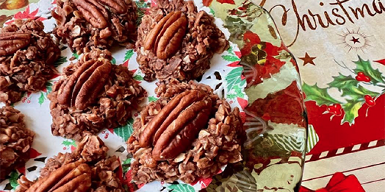 The book is undated, but it has a graphic of an atom on the cover, so I’m guessing it’s from the fifties or sixties. Mrs. Roy Zeagler contributed a no-bake recipe that caught my eye, and I’m so glad she did. These tasty little gems take just minutes to whip up, so if you need a few dozen cookies fast this Christmas, here you go. Mrs. Zeagler thoughtfully noted, “A cherry, pecan half or seasonal cream candy may be put on top of each cookie immediately after dropping cookie on paper.” I love the look of the pecan halves on top, and these will be fine additions to this year’s cookie plates. I hope the recipients love them as much as I do!