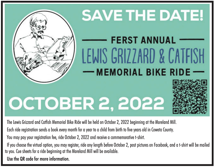 8 a.m., beginning at the Moreland Mill. Each ride registration sends a book every month for a year to a child from birth to five years old in Coweta County. You may pay your registration fee, ride October 2, 2022 and receive a commemorative t-shirt. If you choose the virtual option, you may register, ride any length before October 2, post pictures on Facebook, and a t-shirt will be mailed to you. Cue sheets for a ride beginning at the Moreland Mill will be available. Register HERE.
