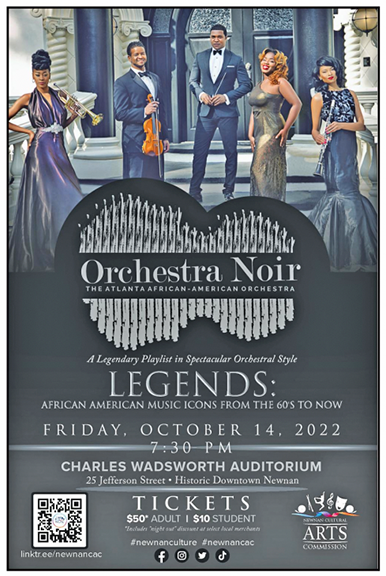 The Atlanta African-American Orchestra Newnan Cultural Arts Commission presents “Legends from the 60s to Present: African American Music Icons.” A legendary playlist in spectacular orchestral style! 7:30 p.m. at the Wadsworth Auditorium, 25 Jefferson Street www.orchestranoir.com/