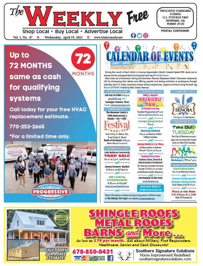 This week’s front page has a Calendar of Events listing for activities taking place around Coweta from April 20 to April 26. Also on the front are spotlight ads featuring Progressive Heating, Air and Plumbing and Southern Signature Solutions.