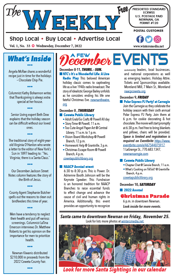 The Weekly front page has much of the December Community Calendar with events and things to do in-and-around Coweta County.