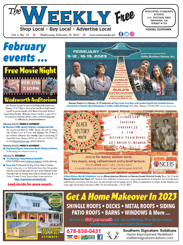 The Weekly front page has some upcoming February events plus sponsored ads from Newnan Theatre Company and Newnan-Coweta Historical Society / African-American Museum.