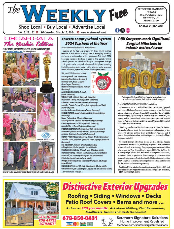 The front page features a Photo Gallery from the Oscar Gala and a pair of lead stories from Coweta County School System and Piedmont Newnan. Plus, look for a Business Spotlight on Southern Signature Solutions and their Distinctive Exterior Upgrades when it comes to Roofing, Siding, Windows, Decks and more.