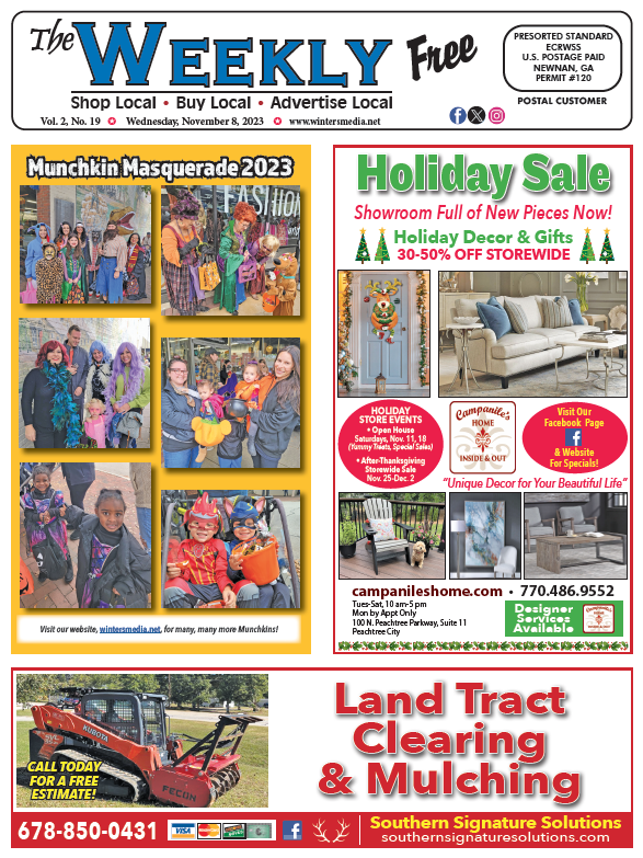 This week’s front page features a Photo Gallery from the City of Newnan’s Munchkin Masquerade on Halloween Day. Plus, readers will find a pair of business spotlights on Campanile’s Home Inside-and-Out and Southern Signature Solutions.