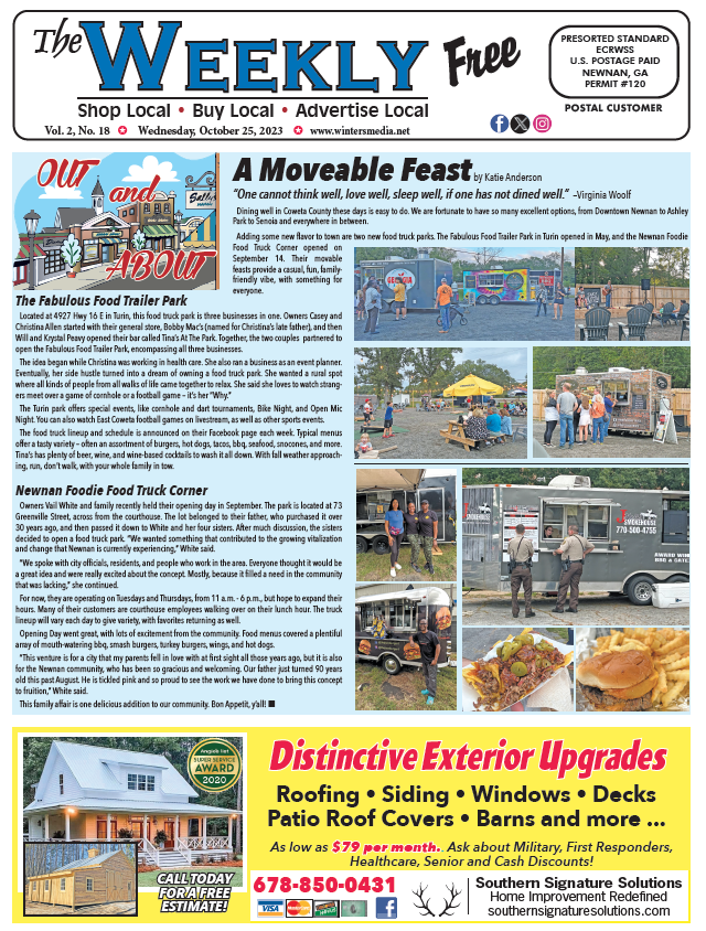 This week’s front page feature story is from our Katie Anderson and what we are calling a Movable Feast aka Food Truck Parks. She takes a look at parks in Turin and downtown Newnan. Plus, readers will find a business spotlight on Southern Signature Solutions.