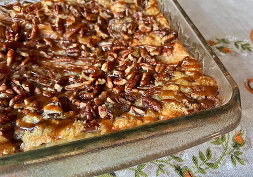 Using an 8- or 9-inch square glass baking dish, melt the remaining four tablespoons of butter in the microwave. Next, pour the flour-and-milk mixture on top of the melted butter. Last, pour the apple mixture on top, allowing the apples to sink down into the batter. Sprinkle cobbler with pecans and bake for 30 minutes. Excellent drizzled with your favorite homemade or purchased caramel sauce and served with vanilla ice cream! Yields 10-12 servings.